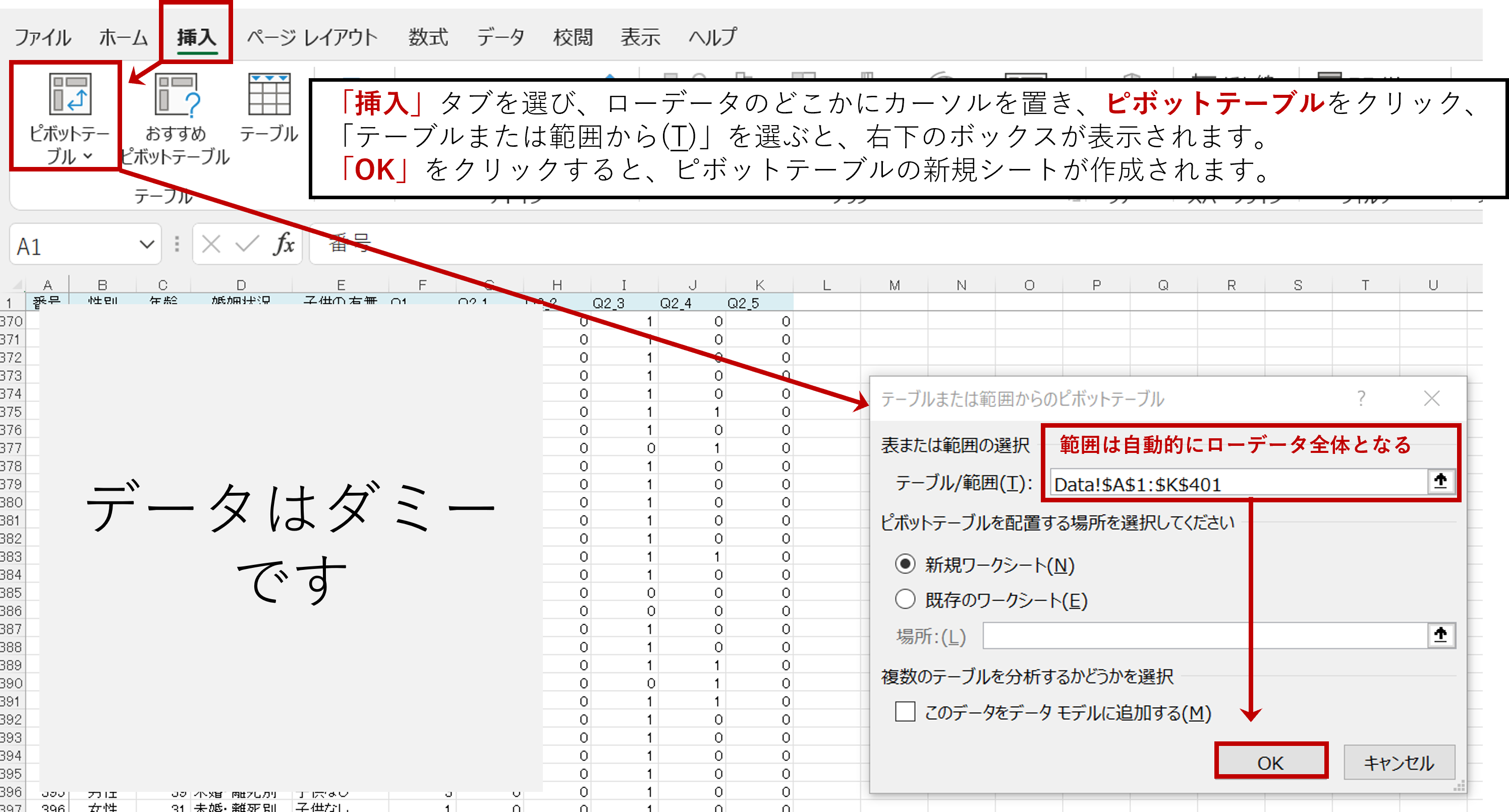 なお、単純集計表を作る場合も、クロス集計表を作る場合も、ピボットテーブル作成手順のうち最初はまったく同じです。