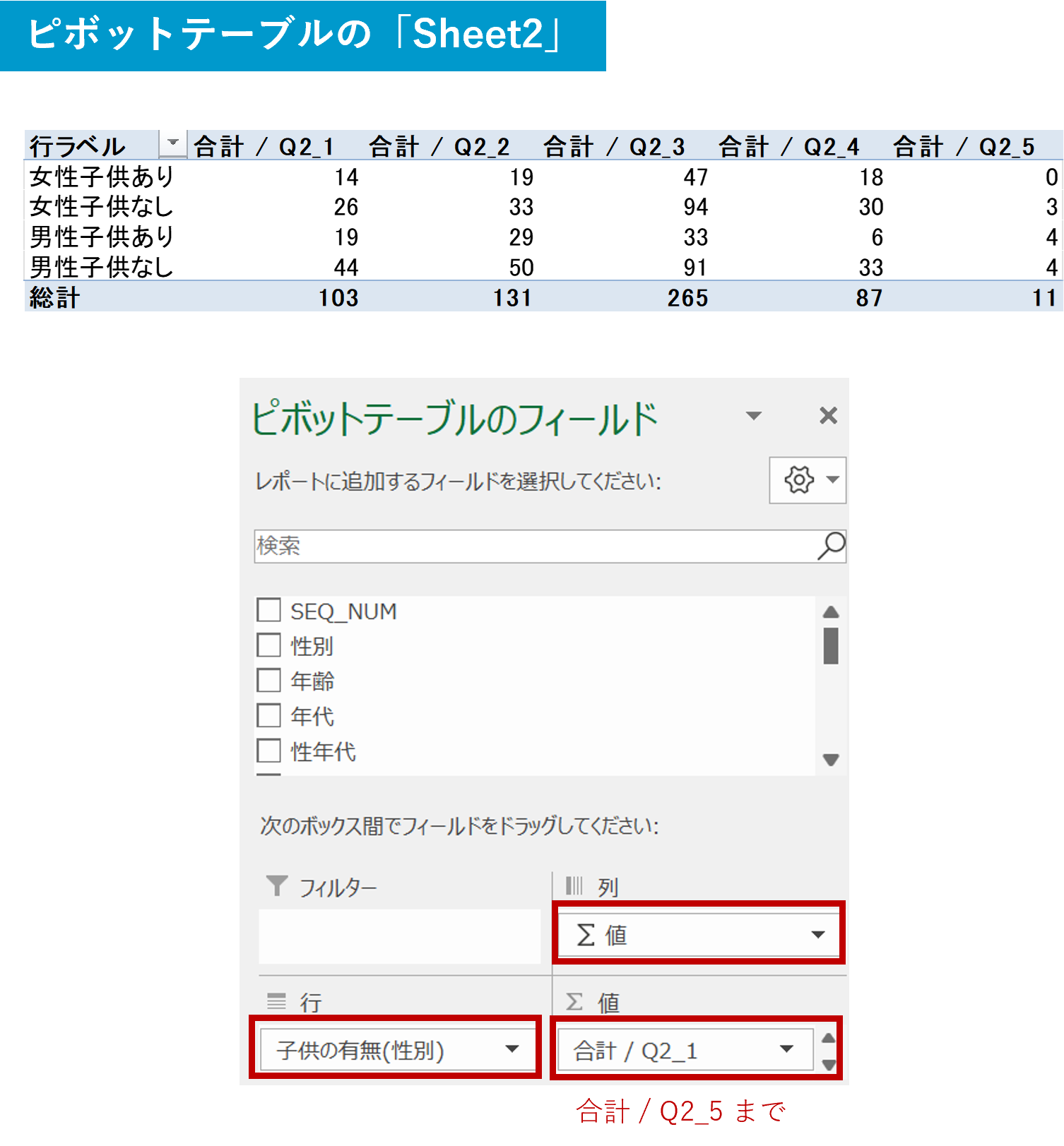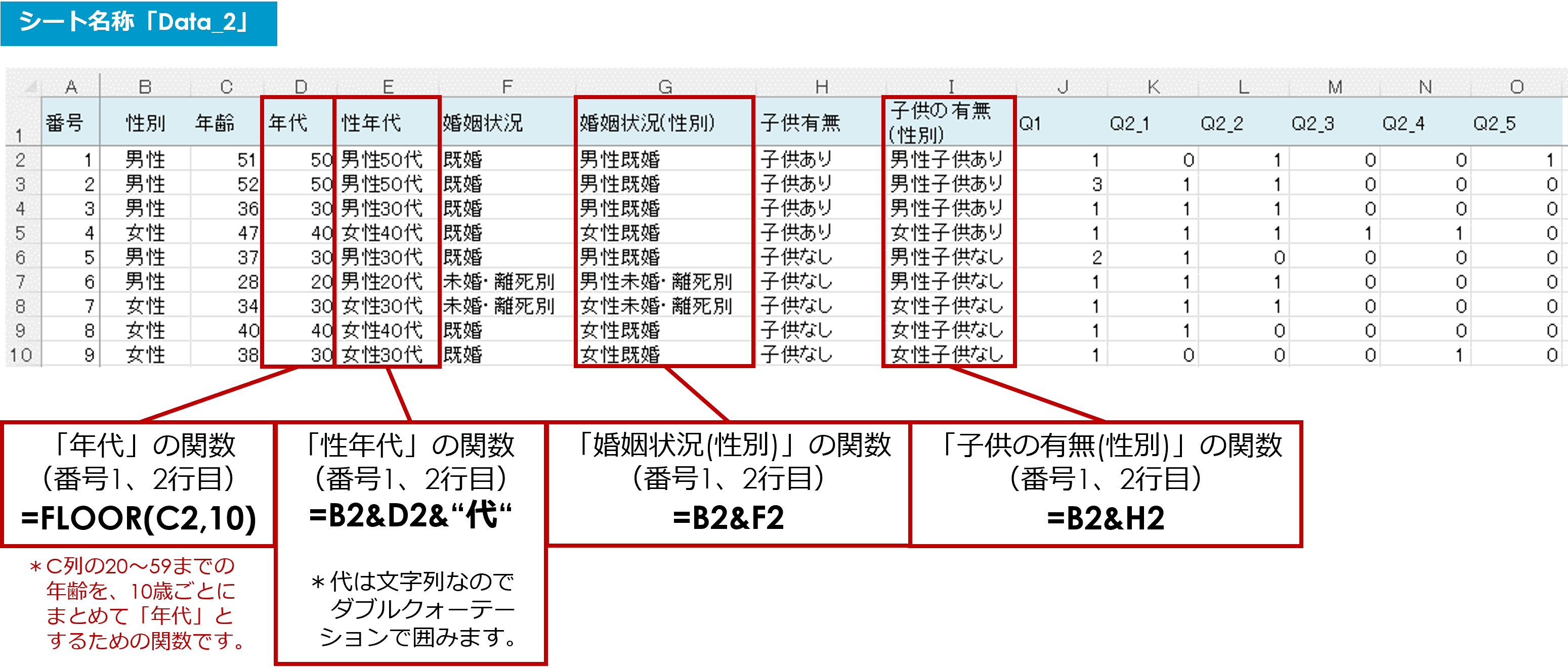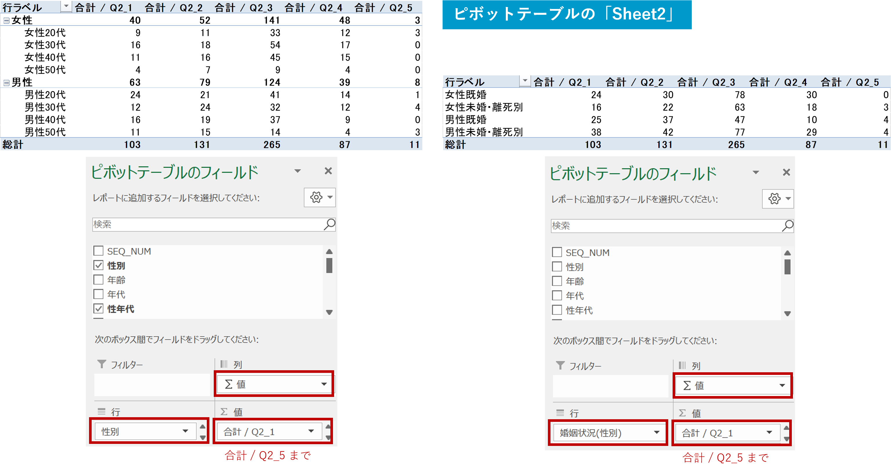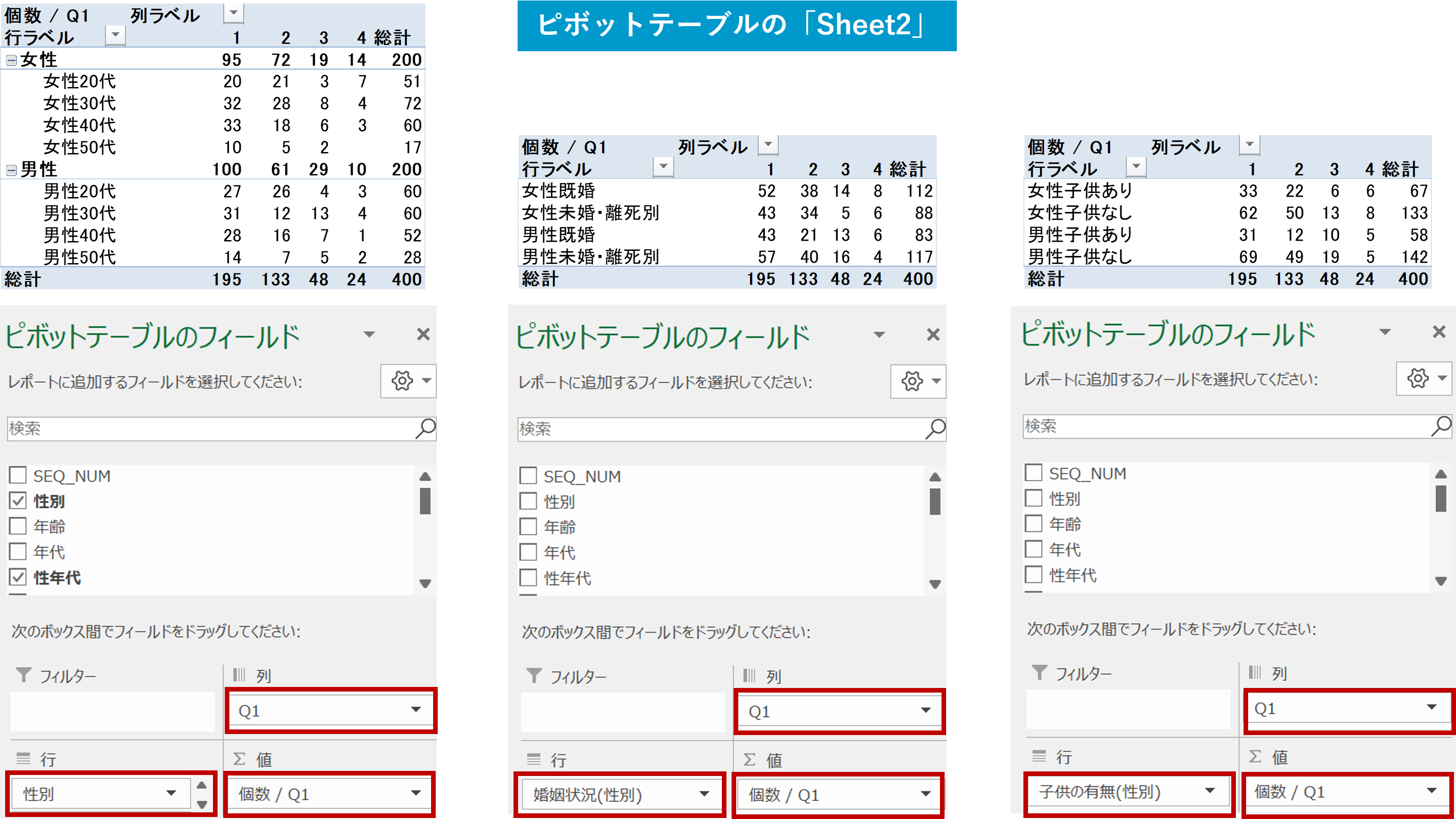 「年代」「性年代」「婚姻状況(性別)」「子供の有無(性別) 」の4つの集計軸となる項目の列を加えたことで、3重クロス集計表を作る準備ができました。