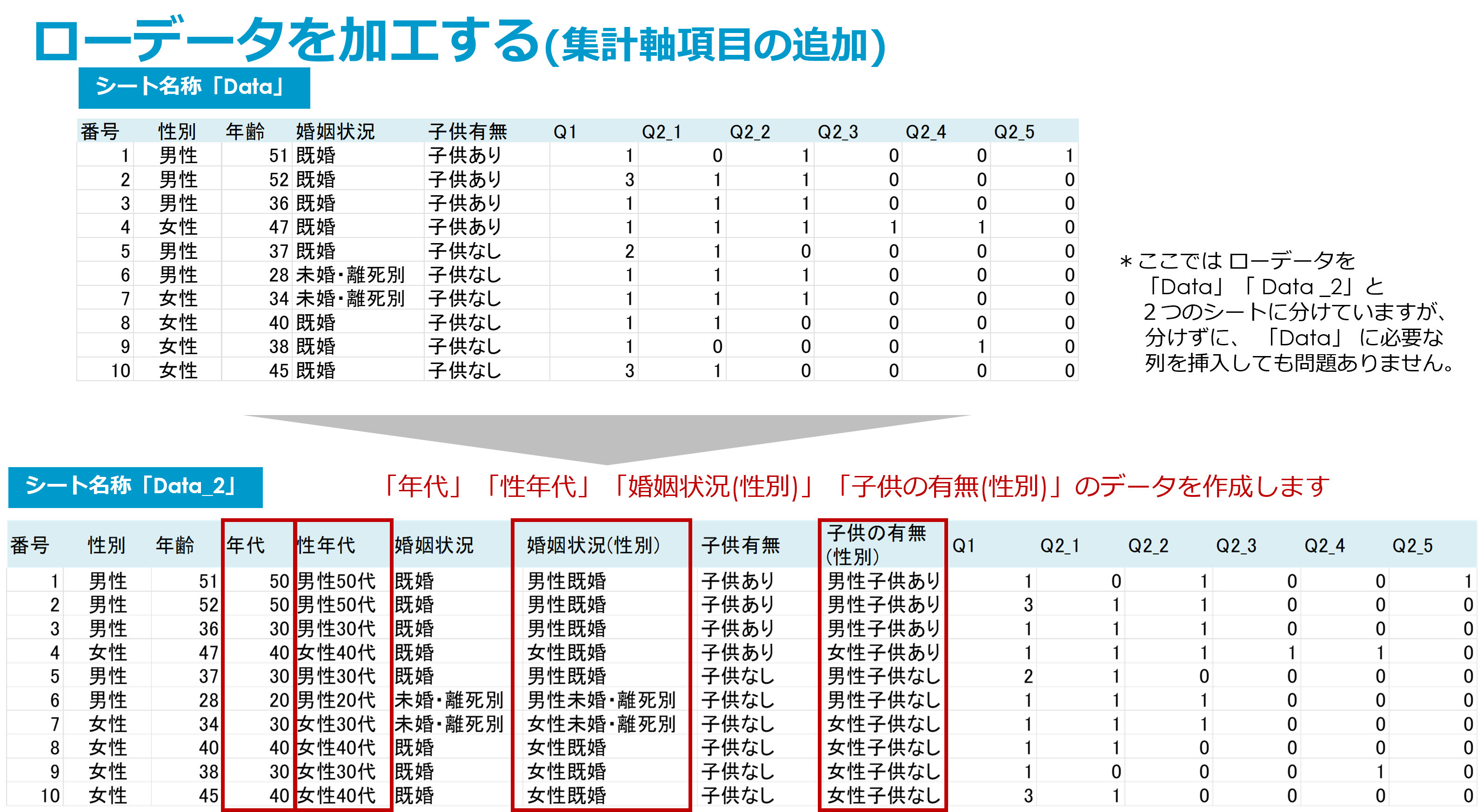 設問の結果をそのまま集計する単純集計とは異なり、「年齢を、年代に変換する」・「複数回答をダミー変数化する」など、クロス集計では、集計軸に合わせたローデータの加工が必要です。この前処理が不十分だと、関数の誤動作や集計ミスにつながるため、ローデータの整備はクロス集計の土台と考えましょう。
