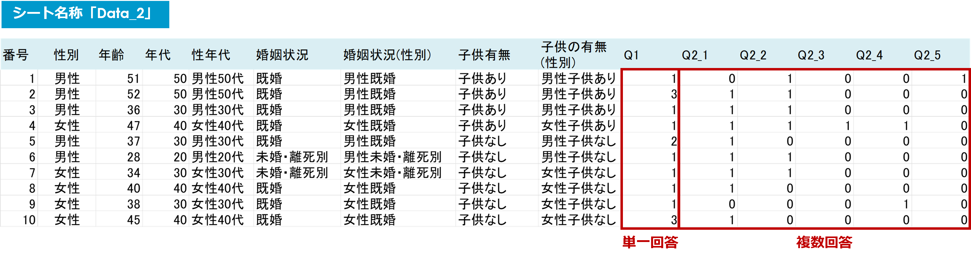 代表的な属性には、性別・年代・婚姻状況・居住地域・職業などがあり、これらを軸にすることで「どんな人がどのように回答したか」を分析できます。