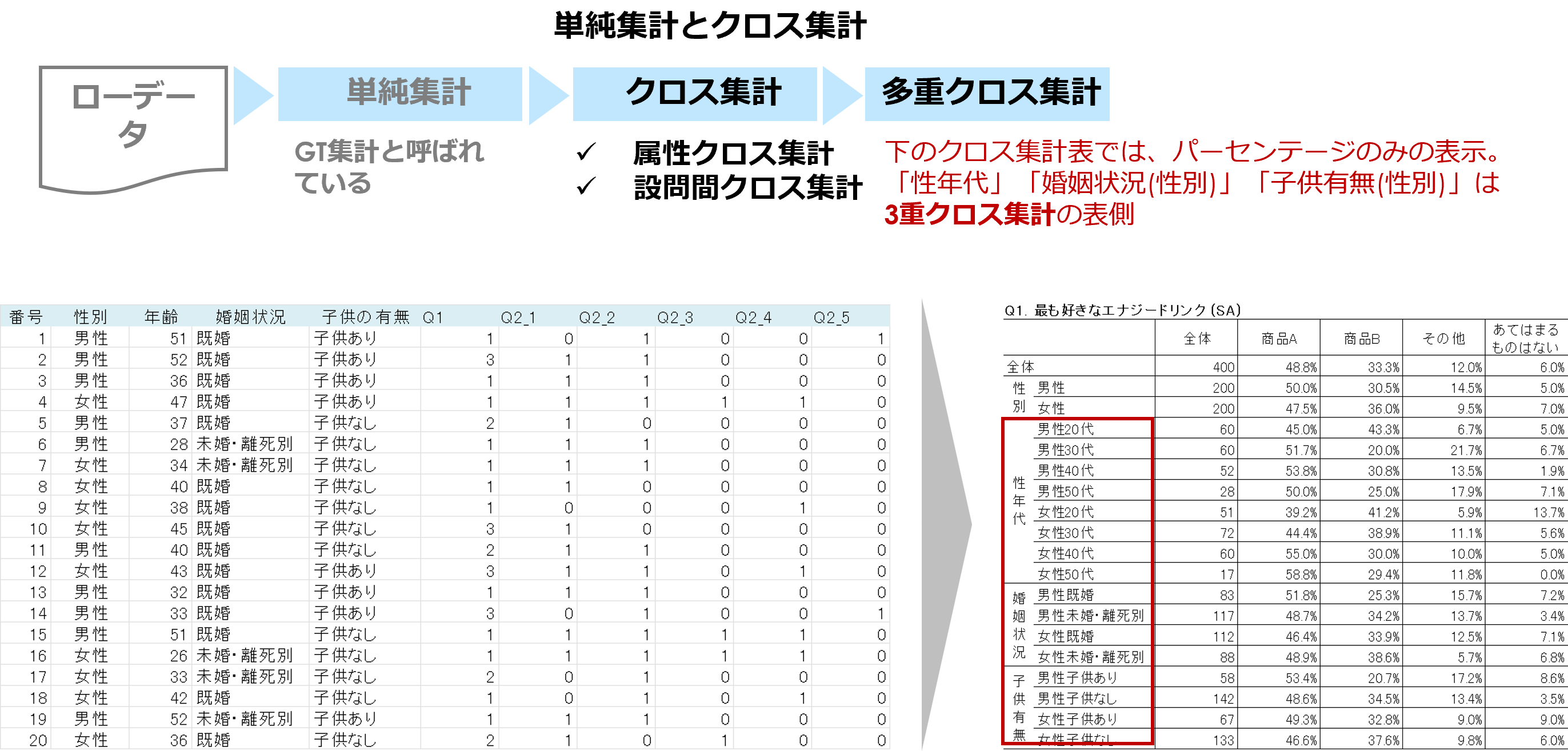 Q:単純集計とクロス集計の違いを、簡単に分かりやすく教えてください。