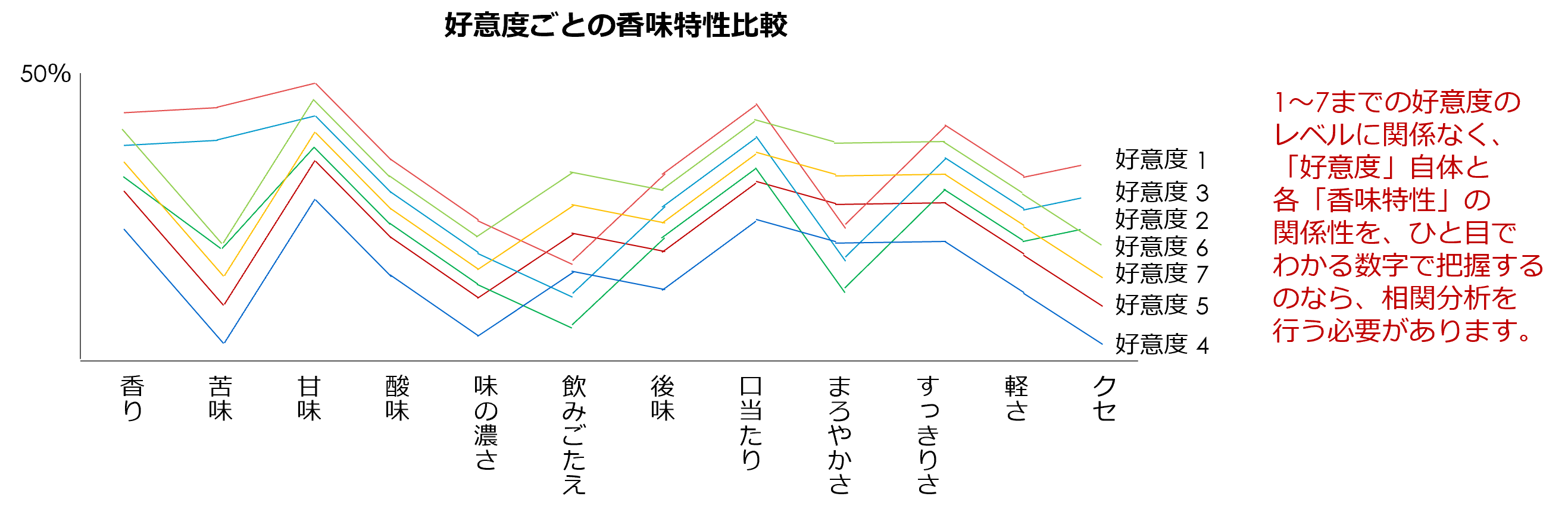 一方、相関分析では、「好意度そのものと香味特性の関係」、さらに「香味特性同士の絶対的な相関関係」を明らかにできます。