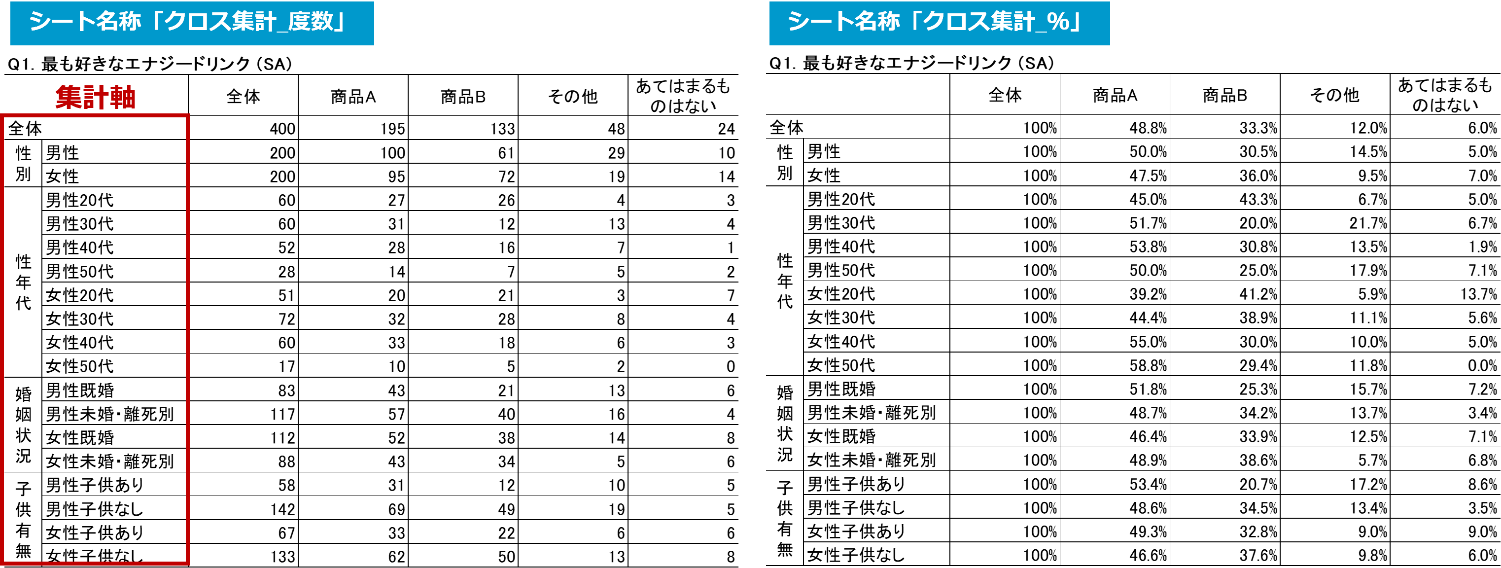 - 構成比(%):全体や属性内での割合。(例:男性20代のうち商品Aを選んだ人=35%)