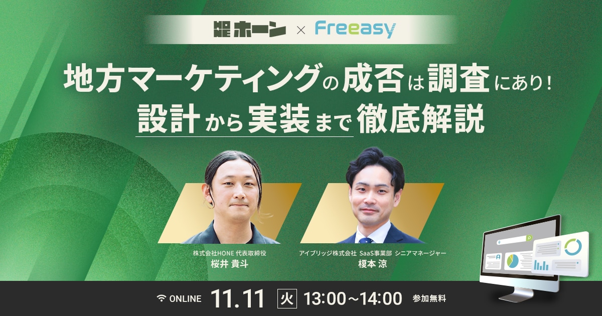 | セミナー名 | 【Freeasy×HONE共催オンラインセミナー】 地方マーケティングの成否は調査にあり!設計から実装まで徹底解説 |