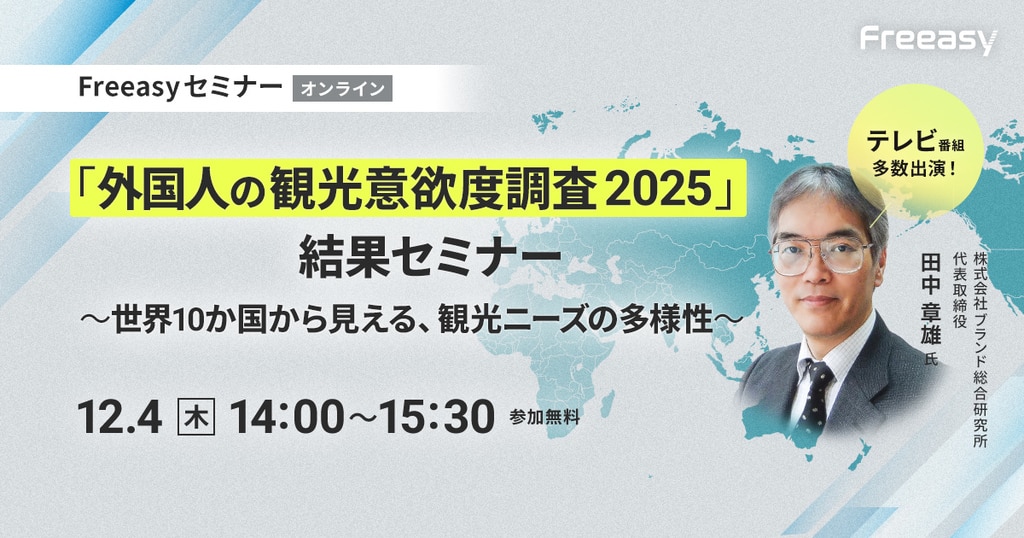 そこで、28の国・地域でのWeb調査を可能としたFreeasy Globalを活用して、世界10か国の消費者による、日本観光の実態と、観光意欲についての調査を行い、その結果を、グローバル調査に精通した専門家・株式会社ブランド総合研究所の田中氏が分かりやすく解説するセミナーを開催します。