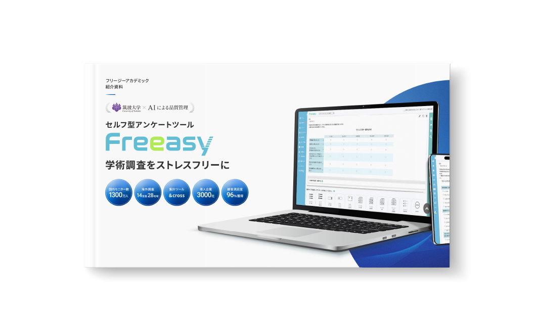 Freeasyでできる学術調査の詳細、 Freeasyを利用した論文実績・導入事例、 倫理審査関連情報などの紹介資料です。