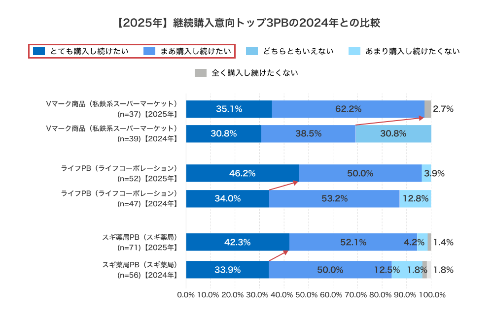 昨年の結果と比べると、最上位の「Vマーク商品(私鉄系スーパーマーケット)」は、「とても購入し続けたい」よりも「まあ購入し続けたい」の方が増えました(23.7ポイント)。2位の「ライフPB(ライフコーポレーション)」と3位の「スギ薬局PB(スギ薬局)」は、「とても購入し続けたい」の方が増えました(それぞれ12.2ポイント・8.4ポイント)。